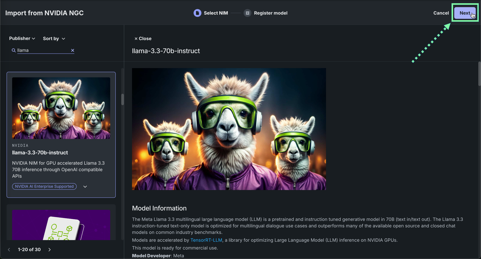 On the Registry > Models tab, next to + Register model, click and then Import from NVIDIA NGC.