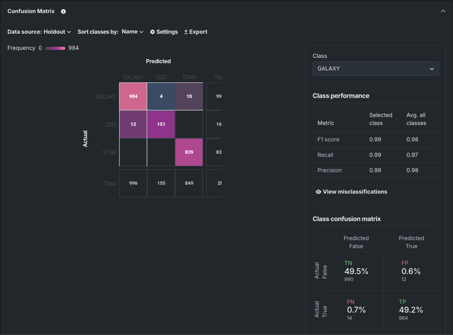 | Confusion matrix | Compares actual with predicted values in multiclass classification problems to identify class mislabeling. | Classification, time-aware |