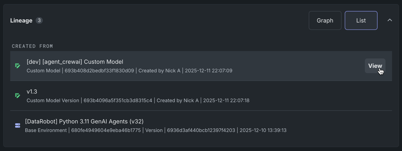 The Lineage section also includes a List view. On the List tab, click the down arrow to reveal all related items. Each item in the list displays its name, ID, the user who created it, and the date it was created. Click View to open the related item. Depending on the type of model version (DataRobot NextGen, DataRobot Classic, custom, or external), you can see different related items.