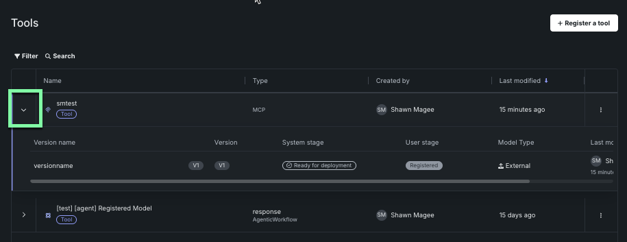 Once you locate the tool or tool version you are looking for, you can access information about the tool or version, along with a variety of management actions. Since a tool is a registered model, you can manage it just as you would for a registered model. See the View and manage registered models page for more information.