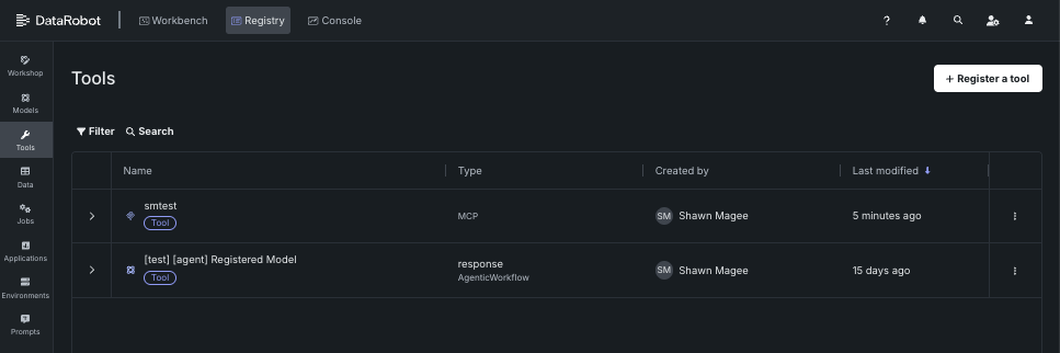 In Registry, agentic tools are grouped into tools, allowing you to categorize them based on the business problem they solve. Once you add tools, you can search and filter them. You can also view tool and version info, share your tools (and the versions they contain) with other users, and download tool packages. Tools can contain DataRobot (Workbench and Classic), custom, and external models as tool versions.