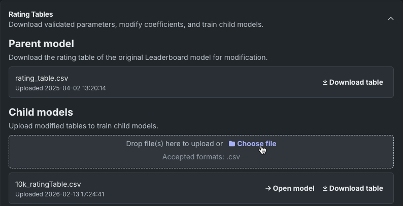 If you modify a child's rating table to iterate on coefficient changes, return to the parent to upload the new table and create a new child. You can then compare scores to evaluate changes. You cannot upload a new rating table to the child model.