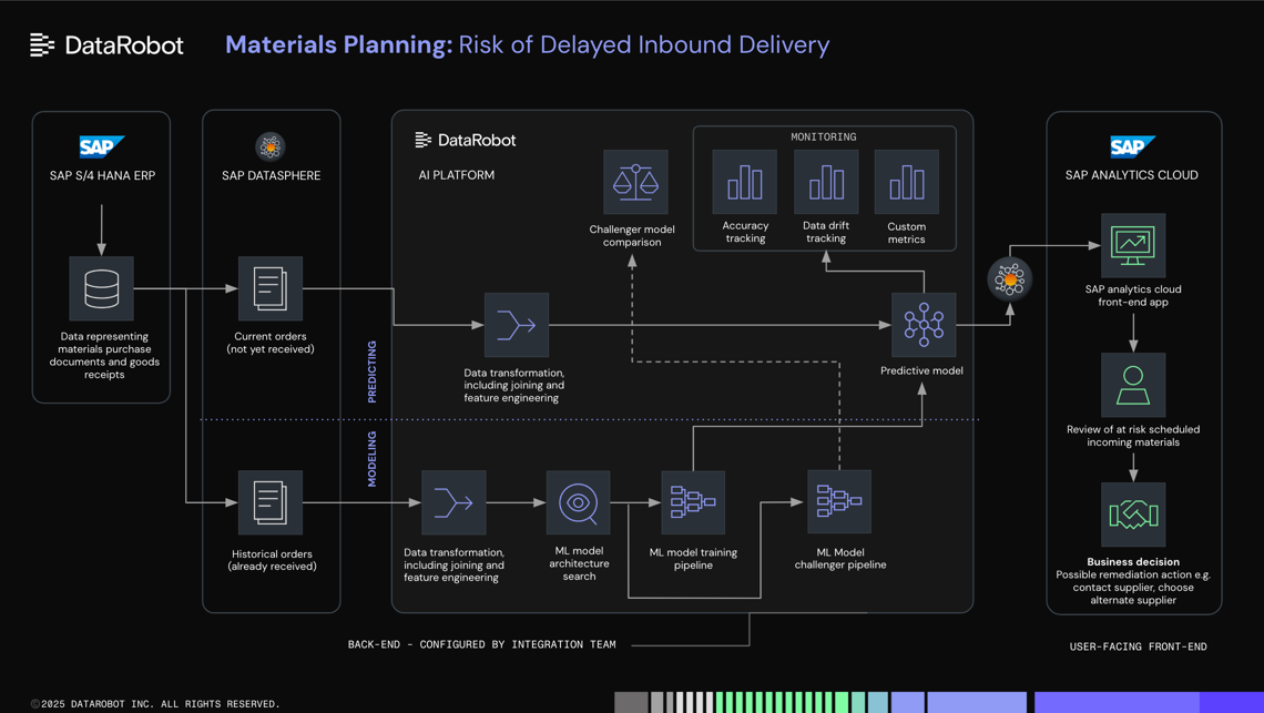 The Materials Planning application template, part of the Supply Chain & Ops Suite, provides a predictive model development and deployment workflow in DataRobot for materials planning to predict the risk of delayed inbound deliveries. It utilizes data sourced from S/4HANA via SAP Datasphere and writes back predictions to Datasphere to allow exposure through Analytics Cloud.