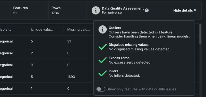 Hover over the icon to learn which check failed, and then you can use the exploratory data insights to correct them.