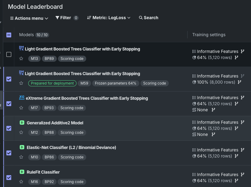 • The Leaderboard itself, a manageable listing of all built models in the experiment.