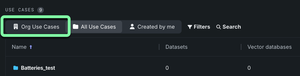 Users with the Use Case admin role can manage all Use Cases available within the organization, regardless of which user owns them. This access can be enabled by the Org Admin on a per-user basis. To access them, log in with Use Case admin access and click Org Use Cases from the Use Case directory in the Workbench.