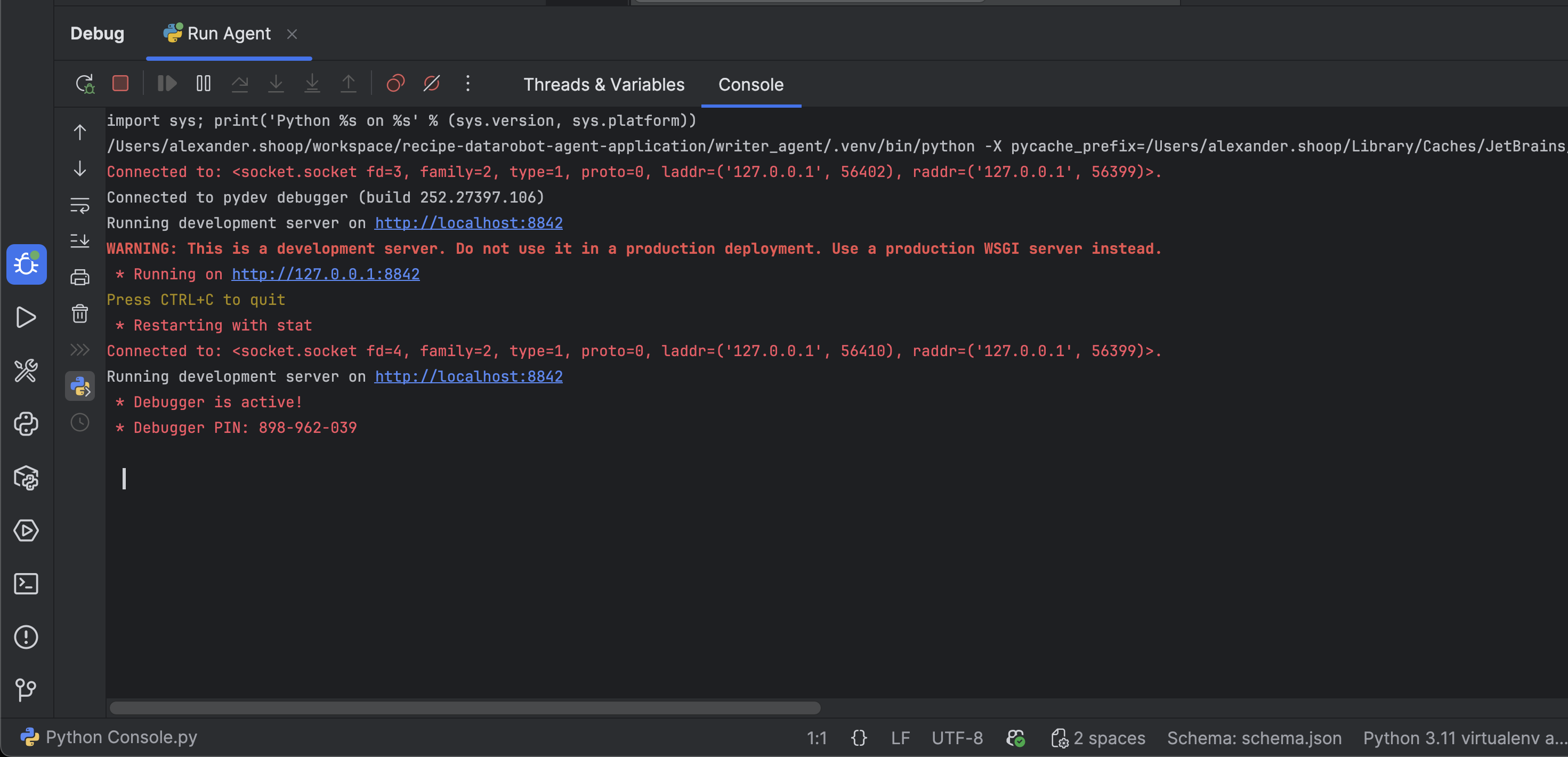 Select Run Agent from the configuration dropdown and click Run. PyCharm starts the development server and shows its console output (for example,