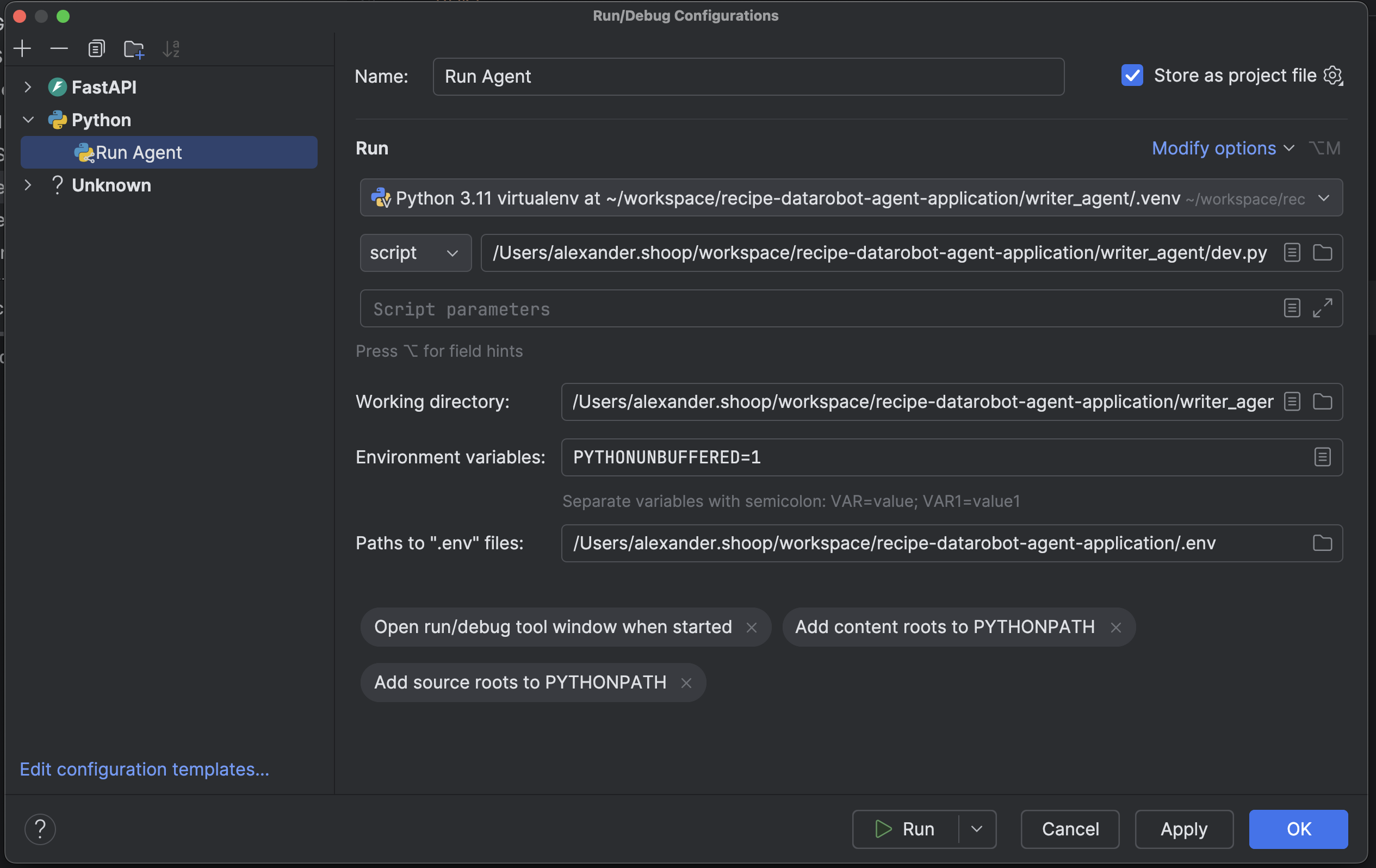 The Run Agent configuration launches the agent development server with your environment variables and interpreter already wired up.
