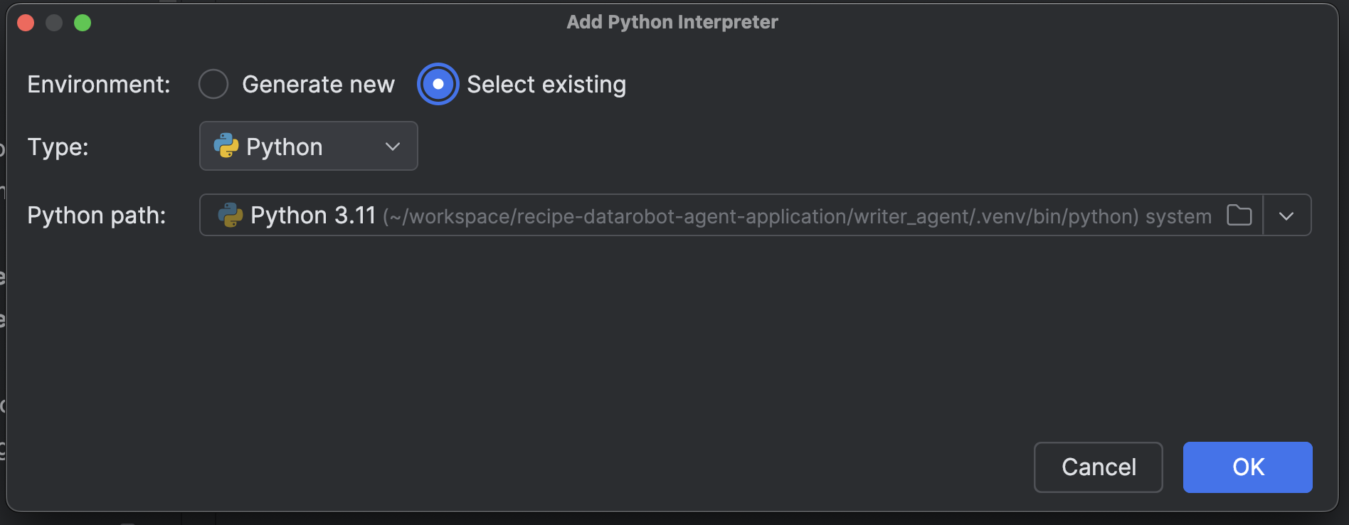 In the Add Python Interpreter dialog, select Select existing and choose Python as the type. Select your agent's virtual environment Python executable in the