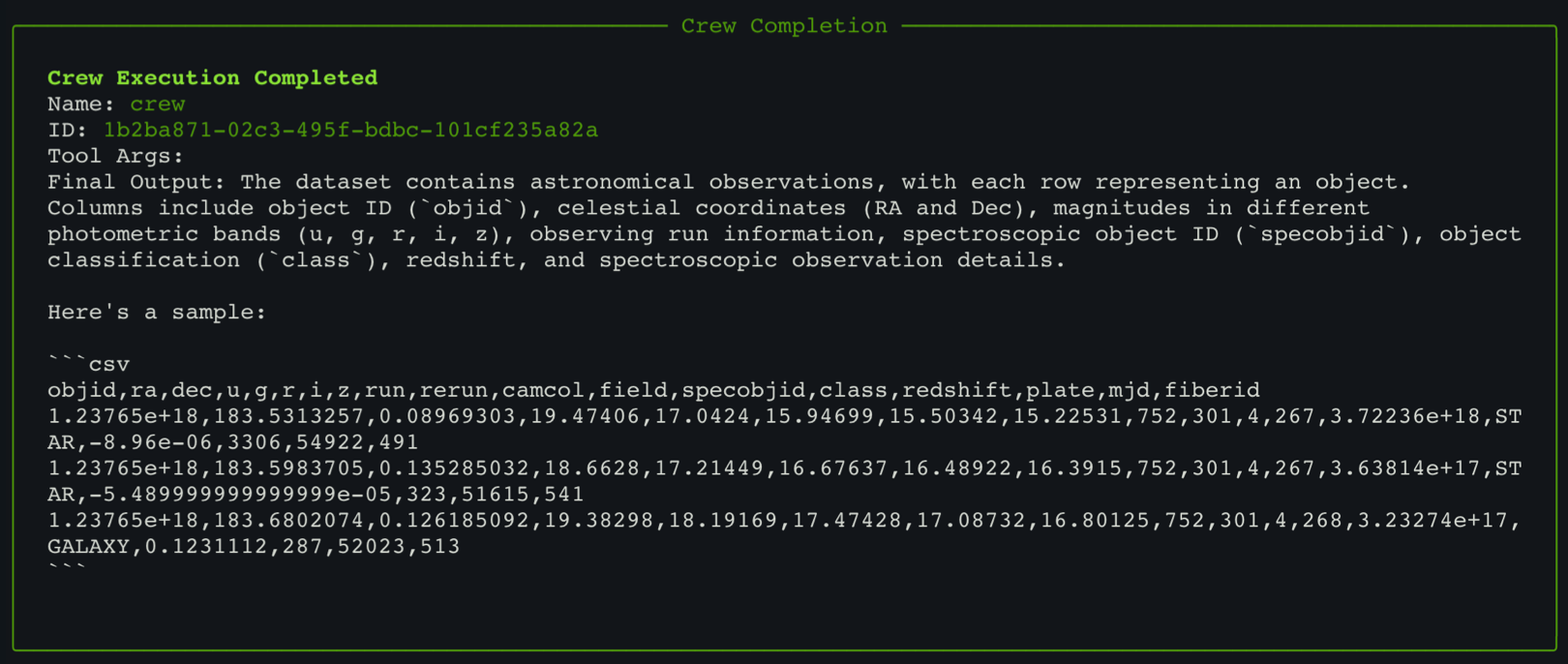 importjsonimportosfromdotenvimportload_dotenvfromtypingimportAny,Generator,Optional,Unionfromurllib.parseimporturljoin,urlparsefromdatarobot_drumimportRuntimeParametersfromcrewaiimportLLM,Agent,Crew,Taskfromcrewai.toolsimportBaseToolfromcrewai_event_listenerimportCrewAIEventListenerfromopenai.types.chatimportCompletionCreateParamsfromragasimportMultiTurnSamplefromragas.messagesimportAIMessage,HumanMessage,ToolMessagefromdatarobot_genai.core.chat.clientimportToolClientfromtool_data_registry_searchimportSearchDataRegistryToolfromtool_data_registry_readimportReadDataRegistryToolload_dotenv()classMyAgent:"""MyAgent is a custom agent that uses CrewAI to search, read, and summarize data from the Data Registry."""def__init__(self,api_key:Optional[str]=None,api_base:Optional[str]=None,model:Optional[str]=None,verbose:Optional[Union[bool,str]]=True,timeout:Optional[int]=90,**kwargs:Any,):"""Initializes the MyAgent class with API key, base URL, model, and verbosity settings. Args: api_key: Optional[str]: API key for authentication with DataRobot services. Defaults to None, in which case it will use the DATAROBOT_API_TOKEN environment variable. api_base: Optional[str]: Base URL for the DataRobot API. Defaults to None, in which case it will use the DATAROBOT_ENDPOINT environment variable. model: Optional[str]: The LLM model to use. Defaults to None. verbose: Optional[Union[bool, str]]: Whether to enable verbose logging. Accepts boolean or string values ("true"/"false"). Defaults to True. timeout: Optional[int]: How long to wait for the agent to respond. Defaults to 90 seconds. **kwargs: Any: Additional keyword arguments passed to the agent. Contains any parameters received in the CompletionCreateParams. Returns: None """self.api_key=api_keyoros.environ.get("DATAROBOT_API_TOKEN")self.api_base=(api_baseoros.environ.get("DATAROBOT_ENDPOINT")or"https://api.datarobot.com")self.model=modelself.timeout=timeoutifisinstance(verbose,str):self.verbose=verbose.lower()=="true"elifisinstance(verbose,bool):self.verbose=verboseself.event_listener=CrewAIEventListener()@propertydefllm(self)->LLM:"""Returns a CrewAI LLM instance configured to use DataRobot's LLM Gateway or a specific deployment. For help configuring different LLM backends see: https://github.com/datarobot-community/datarobot-agent-templates/blob/main/docs/developing-agents-llm-providers.md """api_base=urlparse(self.api_base)ifos.environ.get("LLM_DEPLOYMENT_ID"):path=api_base.pathif"/api/v2/deployments"notinpathand"api/v2/genai"notinpath:# Ensure the API base ends with /api/v2/ for deploymentsifnotpath.endswith("/"):path+="/"ifnotpath.endswith("api/v2/"):path=urljoin(path,"api/v2/")api_base=api_base._replace(path=path)api_base_str=api_base.geturl()deployment_id=os.environ.get("LLM_DEPLOYMENT_ID")returnLLM(model="openai/gpt-4o-mini",api_base=f"{api_base_str}deployments/{deployment_id}/",api_key=self.api_key,timeout=self.timeout,)else:# Use LLM Gatewayapi_base_str=api_base.geturl()ifapi_base_str.endswith("api/v2/"):api_base_str=api_base_str[:-7]# Remove 'api/v2/'elifapi_base_str.endswith("api/v2"):api_base_str=api_base_str[:-6]# Remove 'api/v2'returnLLM(model="datarobot/azure/gpt-4o-mini",api_base=api_base_str,api_key=self.api_key,timeout=self.timeout,)@propertydeftools_client(self)->ToolClient:returnToolClient(api_key=self.api_key,base_url=self.api_base,)## Data Registry tools@propertydeftool_data_registry_search(self)->BaseTool:deployment_id=os.environ.get("DATA_REGISTRY_SEARCH_TOOL_DEPLOYMENT_ID")ifnotdeployment_id:deployment_id=RuntimeParameters.get("DATA_REGISTRY_SEARCH_TOOL_DEPLOYMENT_ID")print(f"Initializing Data Registry Search Tool with deployment ID: {deployment_id}")returnSearchDataRegistryTool(tool_client=self.tools_client,deployment_id=deployment_id)@propertydeftool_data_registry_read(self)->BaseTool:deployment_id=os.environ.get("DATA_REGISTRY_READ_TOOL_DEPLOYMENT_ID")ifnotdeployment_id:deployment_id=RuntimeParameters.get("DATA_REGISTRY_READ_TOOL_DEPLOYMENT_ID")print(f"Initializing Data Registry Read Tool with deployment ID: {deployment_id}")returnReadDataRegistryTool(tool_client=self.tools_client,deployment_id=deployment_id,)## Data Registry agents and tasks@propertydefagent_data_registry_searcher(self)->Agent:returnAgent(role="Expert Data Registry Searcher",goal="Search for and retrieve relevant files from Data Registry.",backstory="You are a meticulous analyst that is skilled at examining lists of files and ""determining the most appropriate file based on the context.",verbose=self.verbose,allow_delegation=False,llm=self.llm,)@propertydeftask_data_registry_search(self)->Task:returnTask(description=("You should search for a relevant dataset ID in the Data Registry based on the provided dataset topic: ""{dataset_topic}."),expected_output=("Search for a list of relevant files in the Data Registry and determine the most ""relevant dataset ID that matches the given topic. You should return the entire dataset ID."),agent=self.agent_data_registry_searcher,tools=[self.tool_data_registry_search],)@propertydefagent_data_registry_reader(self)->Agent:returnAgent(role="Expert Data Registry Data Reader and Analyst",goal=("Read the data from a file in the Data Registry and summarize the csv data to answer a question.""The file is likely relatively large, so you should read it in chunks if necessary to answer the question."),backstory="When provided with a dataset name and a dataset ID, you are an expert at using your available""tools to read the data. You always return your responses in a csv style format.""You are an expert at analyzing and understanding csv data, especially when comma separated ""data is presented to you as a string. When provided with a dataset ID you always use your tools ""to read the data, especially data from the Data Registry as you have tools available to you that ""can read the data directly from the Data Registry. You take care to not read too much data at once, ""and read it in chunks, especially when you don't know the data