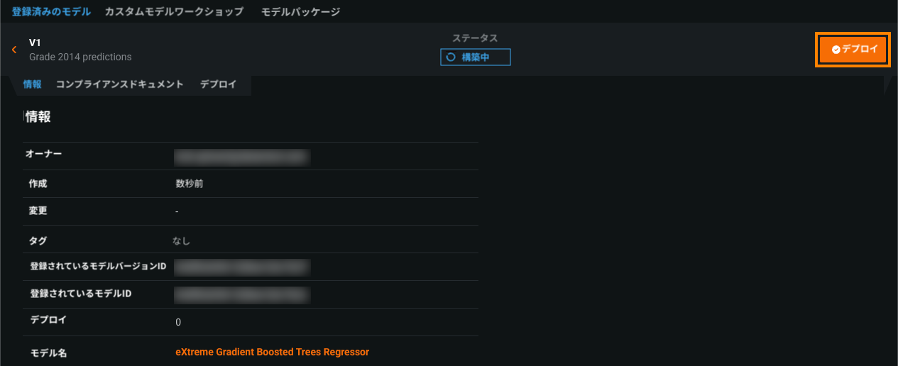 登録モデルの構築中に、デプロイをクリックして、デプロイ設定を行います。