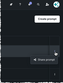 ユーザー、グループ、または組織とプロンプトを共有できます。 オーナーは、既存のプロンプトから共有、ロールの変更、または新しいバージョンの作成ができます。 プロンプトを共有するには、アクションメニュー をクリックし、プロンプトを共有を選択します。