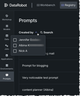 You can filter the prompt table to list only those prompts created by certain users. To do so, select prompt creators from the Created by dropdown.