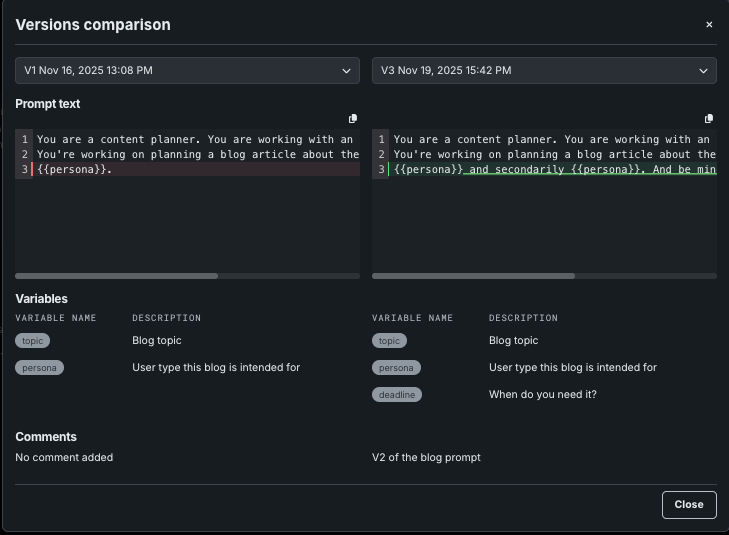 プロンプトのバージョン管理は、時間の経過に伴うプロンプトの変更を管理する上で極めて重要です。なぜなら、わずかな変更であっても、LLMの出力を大きく左右する可能性があるためです。 これにより、再現性が確保され、チームは特定のモデル出力を生成した正確なプロンプトバージョンにリンクできます。また、新しい変更によってパフォーマンスが低下した場合に、安定したバージョンへの迅速なロールバックが容易になります。