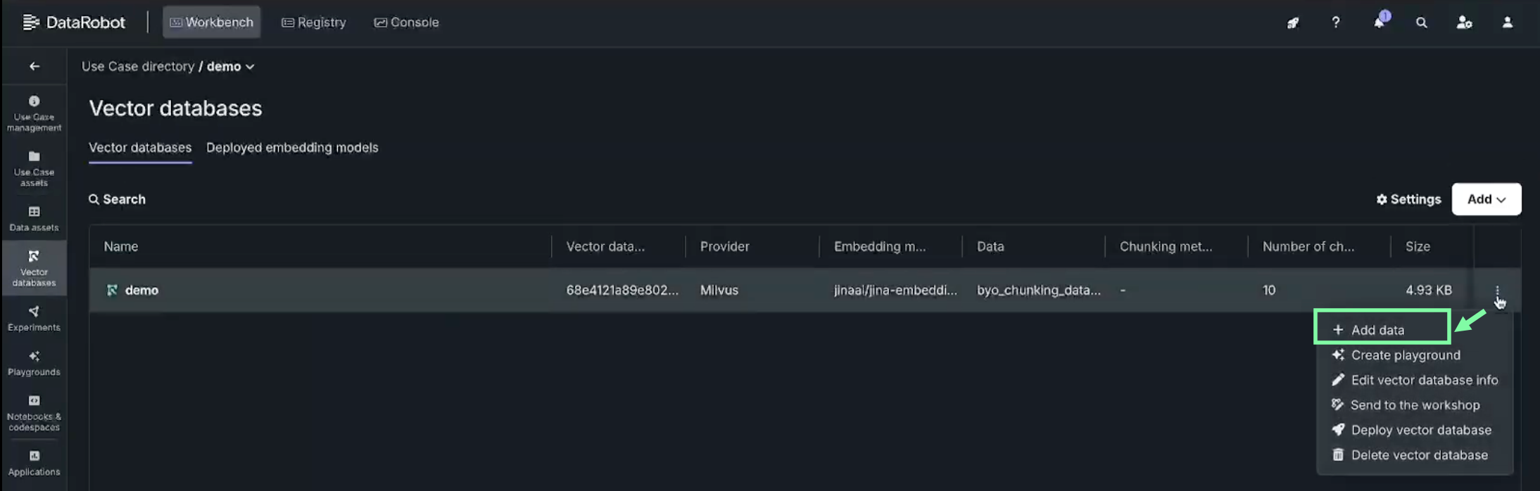 - データソースドロップダウン。すべてのユースケースのベクターデータベースにアクセスでき、データ追加のオプションがあります。