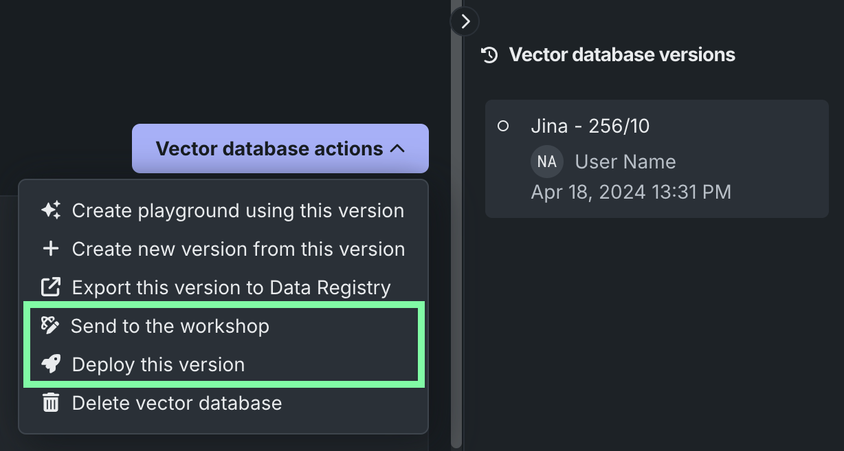 | ワークショップに送信 | ベクターデータベースをワークショップに送信して、変更およびデプロイします。 |