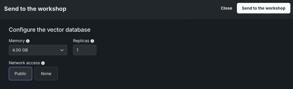 プレイグラウンドからワークショップにベクターデータベースを送信するには、ワークショップに送信をクリックし、以下の情報を入力します。