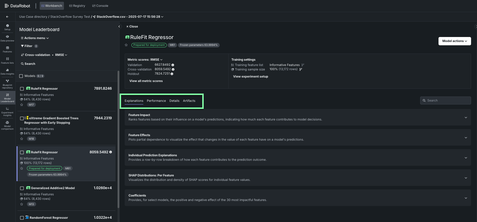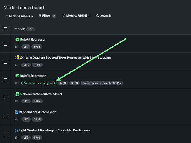 Now that a set of models are ready for analysis, select the top model and explore its details. DataRobot flags the most accurate model as Prepared for deployment in the Model Leaderboard.