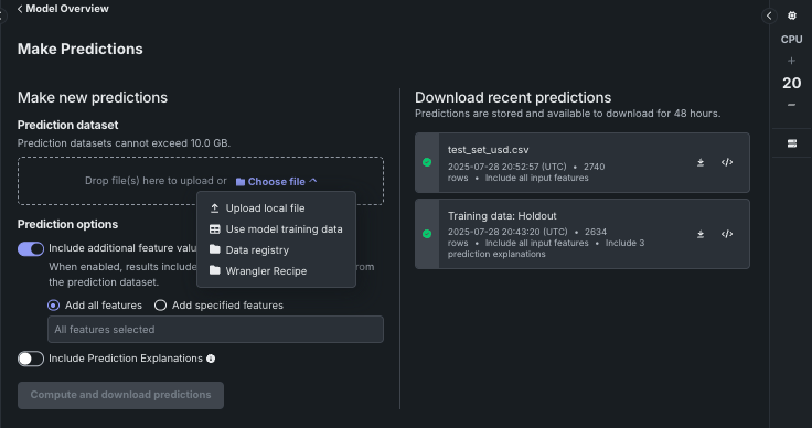 Once the new data is uploaded and processed, click Compute and download predictions to generate the predictions. This process can take some time, depending on the size of the dataset.