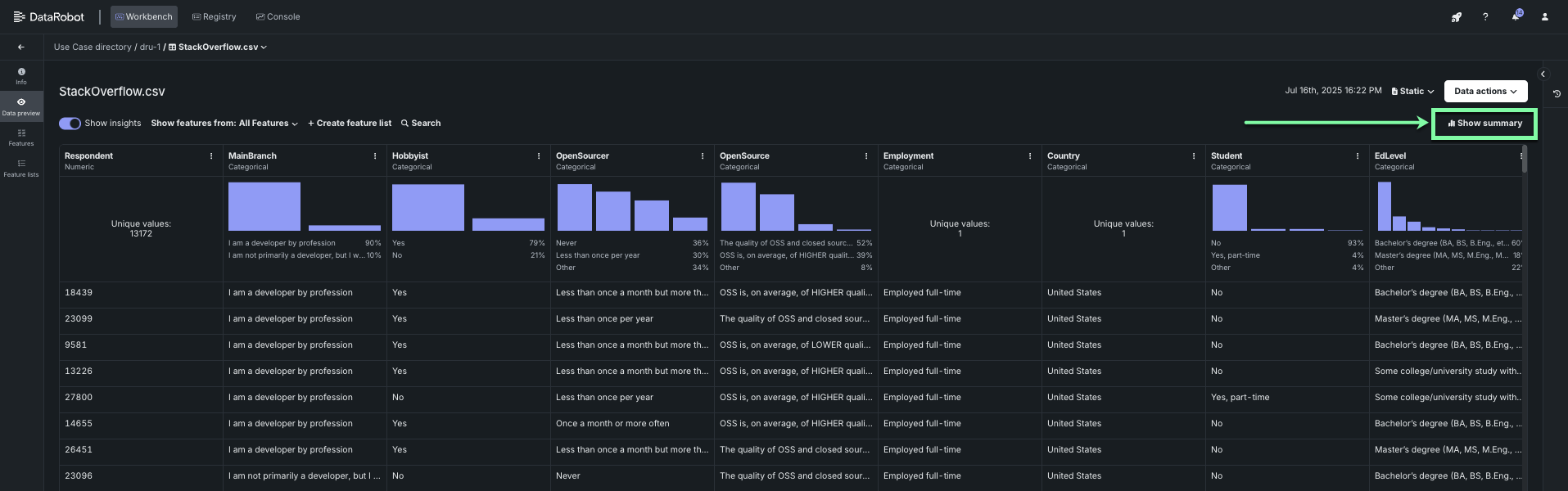 Each row in the table shown represents a survey response and each column represents that person's answers. Clicking the Show summary button (indicated below) displays the Data Quality Assessment Summary.