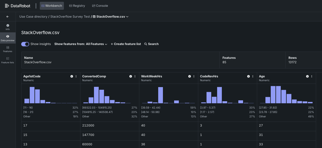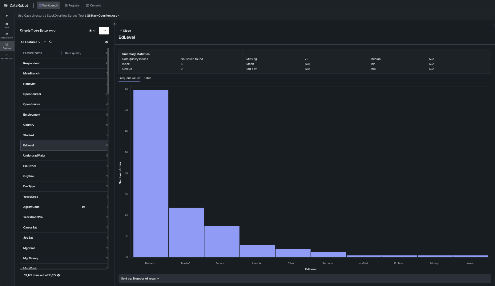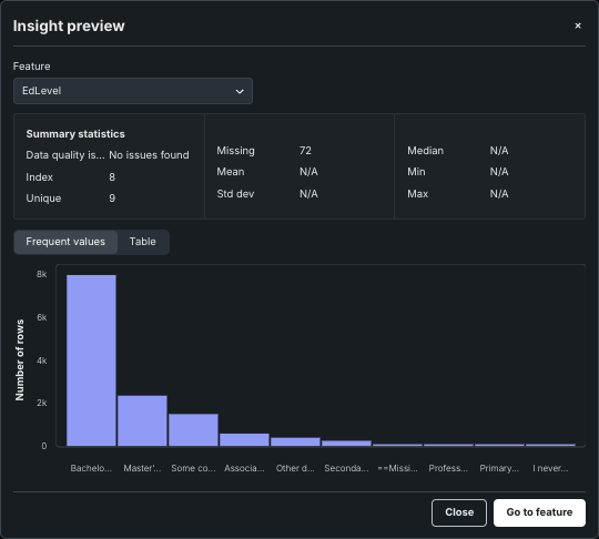 As shown above, the Summary statistics area provides valuable insight into the feature data itself, including an assessment of whether the data has any issues. The histogram shows the distribution of the data on a per-education level basis, as the EdLevel feature is selected. From this view, it is clear that the majority of responses contained in the dataset are from individuals with a Bachelor's degree or higher. (For more details on data quality issues, see [#identify-data-quality-issues] later in this walkthrough.)
