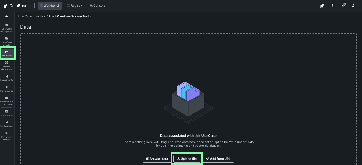 DataRobot automatically opens the new Use Case, showing the Use Case assets tile. From here, the Use Case is ready for data to be uploaded.