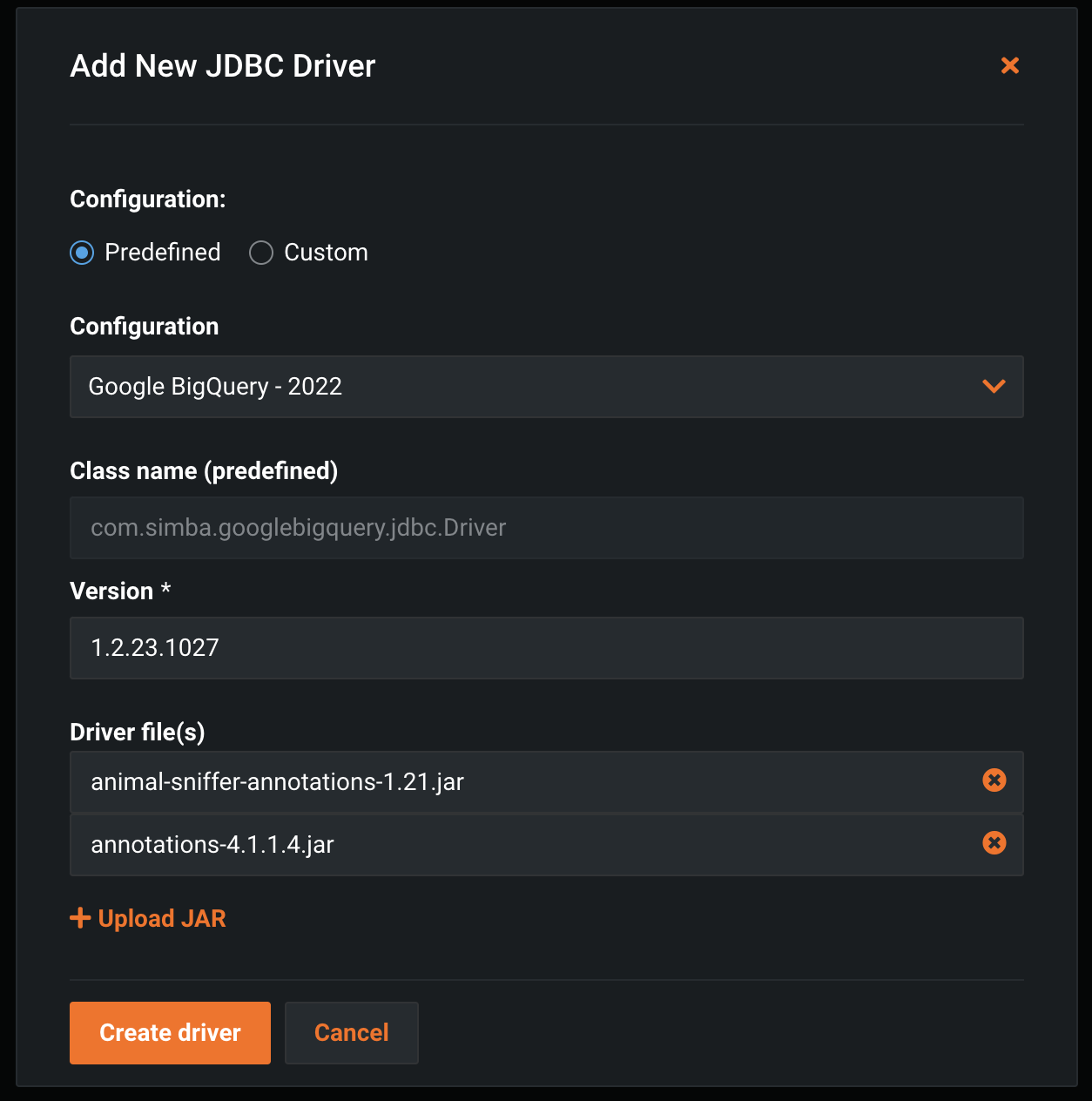 Although it's possible to set up the JDBC driver manually, it's not recommended as each individual JAR file in the ZIP bundle needs to be uploaded one-by-one. You must also add the JAR files in alphabetical order.