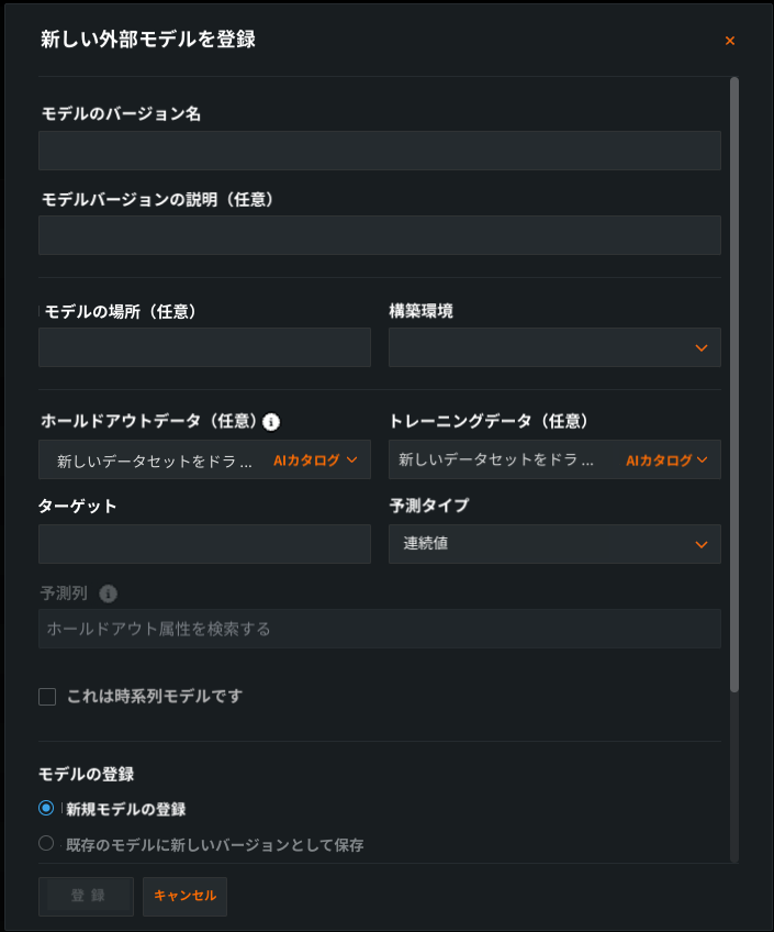 フィールド 説明 モデルの登録 次のいずれかを選択: - 新規モデルの登録:登録済みのモデルを新規作成します。 これにより、最初のバージョン(V1)が作成されます。