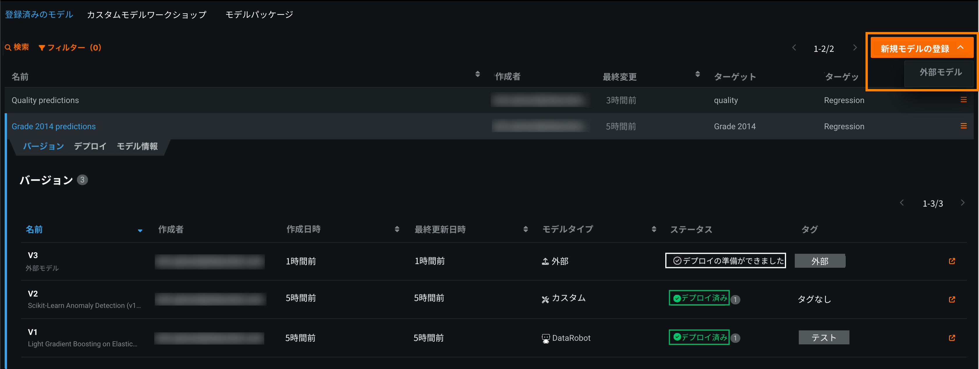 モデルレジストリ > 登録済みのモデルページで、新規モデルを登録 > 外部モデルをクリックします。