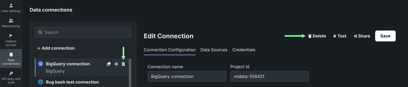 Click the Delete button in the upper right, or hover over the connection name in the left-panel and click the delete icon .