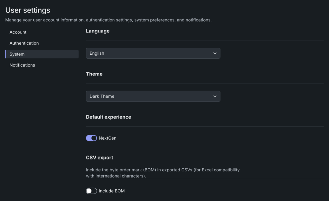 | CSVエクスポート | エクスポートされたCSVファイルへのBOM挿入を有効または無効にするには、BOMを含めるトグルを切り替えます。 この設定はデフォルトで無効になっています。 |