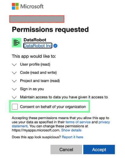 DataRobotでこの機能を有効にする前に、Microsoft Entra IDで、クラウドアプリケーション管理者はDataRobotアプリケーションに対してテナント全体の同意を付与する必要があります。