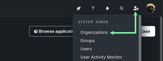 上部ツールバーのシステム管理者アイコンをクリックし、組織を選択します。