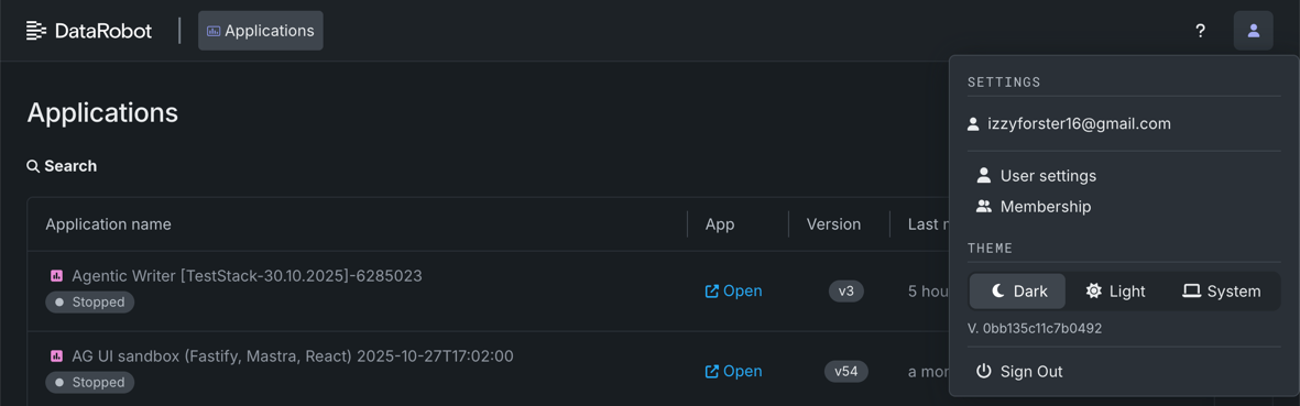 DataRobotの右上にあるプロフィールアバター(またはデフォルトのアバター
