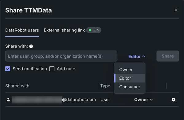 共有モーダルの機能はDataRobot全体でほぼ同じですが、アセットタイプによって多少異なる場合があります。 具体的には、外部共有、メモの追加や通知の送信、共有ロールなどが異なります。 以下に例を示します。