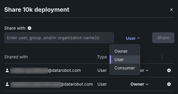 コラボレーションを強化するために、DataRobotの他のユーザーやグループ、組織のメンバーとアセットを共有できます。 ただし、共有する場合は、ユーザーとグループが同じ組織に属している必要があることに注意してください。 詳細については、テナントの分離とコラボを参照してください。