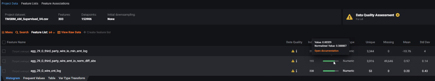 有用性の値はプロジェクトの指標に基づきます。 ただし、ターゲットリーケージの検出に使用される値はGINIに基づいています。 ユーザーにターゲットと特徴量のヒストグラムを目視で確認してもらうか、Gini Normでプロジェクトを再起動してこれらの値を確認してもらってください。