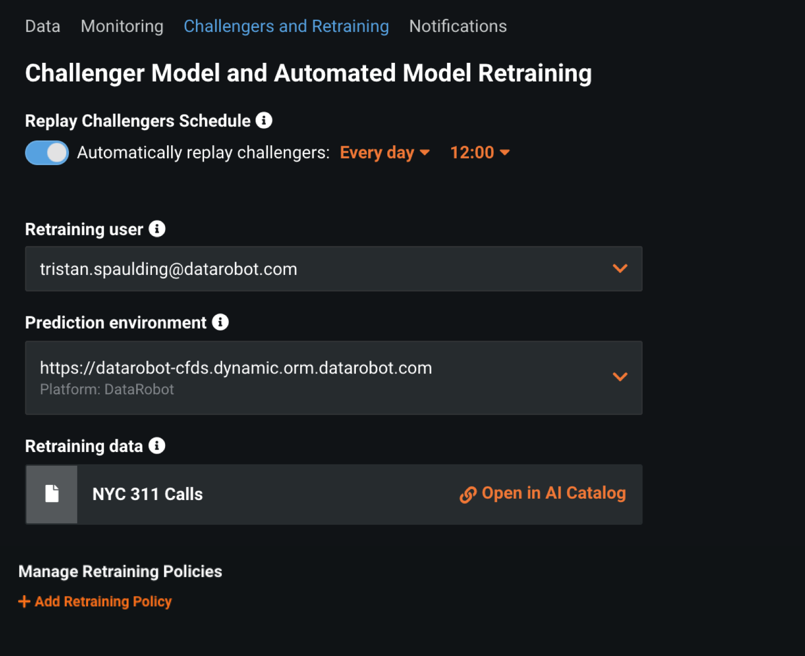 To set up automatic retraining, provide a retraining dataset and define up to five retraining policies on each deployment, each consisting of a trigger, a modeling strategy, modeling settings, and a replacement action. When triggered, retraining produces a new model based on these settings and notifies you to consider promoting it.