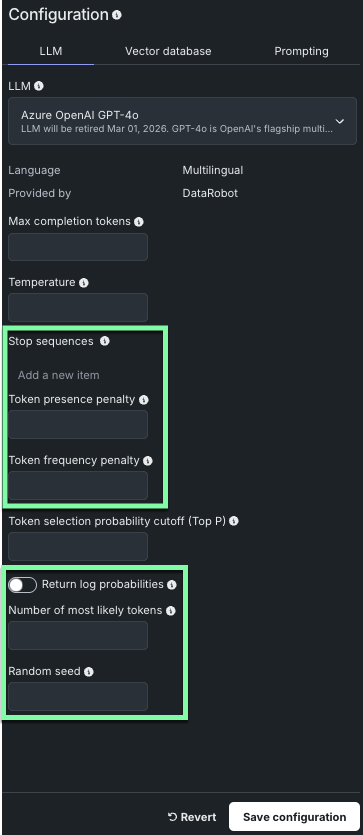 DataRobotでは、LLMブループリントの作成時にサポートされるLLMモデルが新たに多数追加されました。 新たに加わったモデルの中には、以下に示すように、モデルパラメーターが追加されているものもあります。