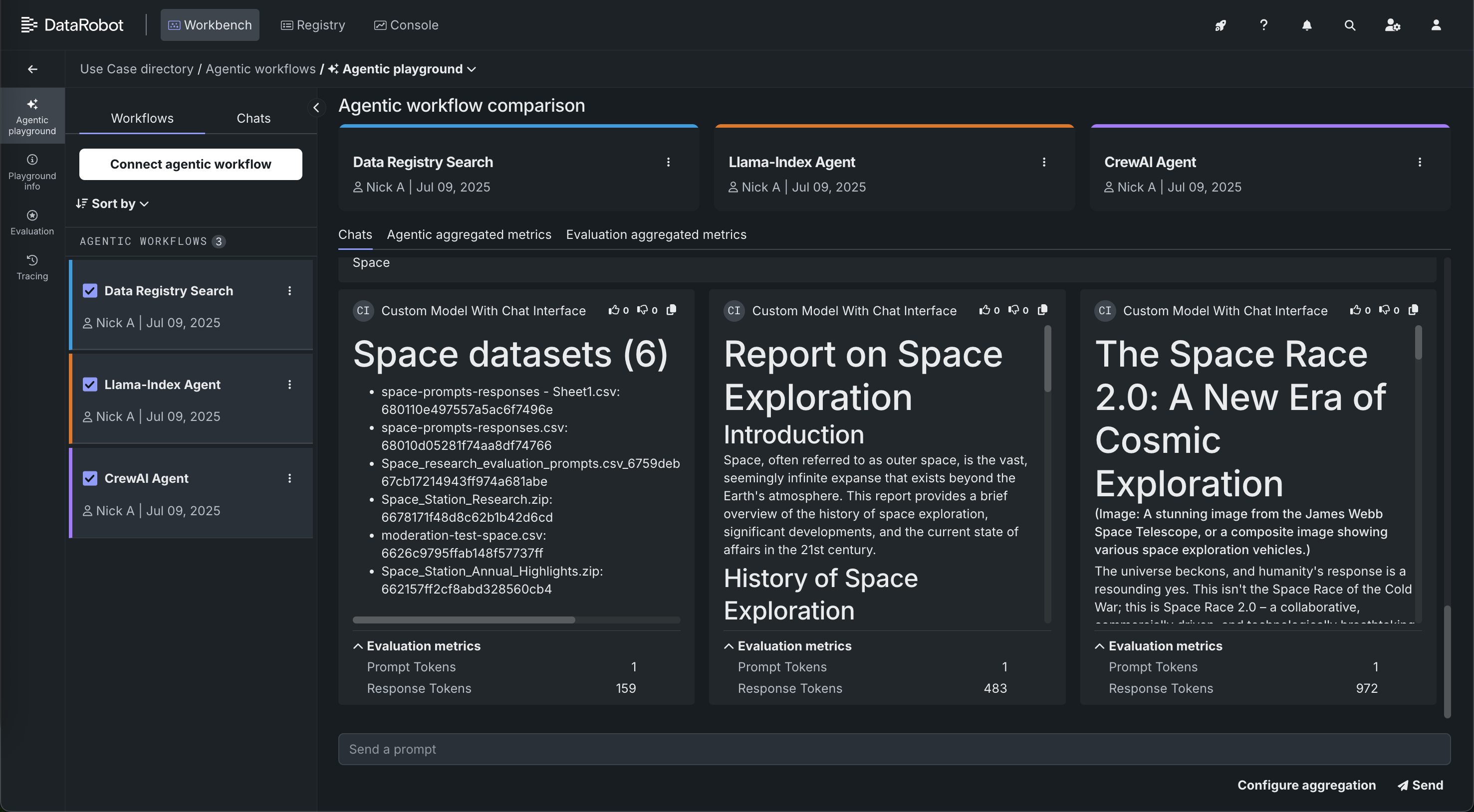 LangGraph、LlamaIndex、CrewAIなどのフレームワークで構築された独自の(BYO)エージェントワークフローをレジストリワークショップから新しいエージェントプレイグラウンドに持ち込み、テストとファインチューニングを行います。