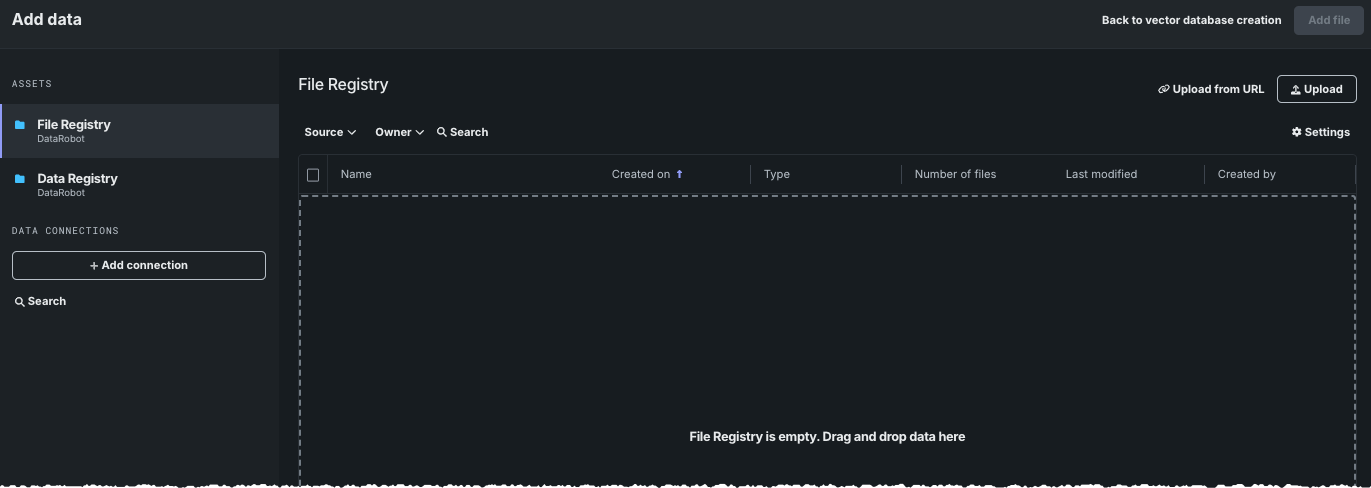 ファイルレジストリは、あらゆるタイプのデータを保存できる「汎用」ストレージシステムです。 データレジストリとは異なり、ファイルレジストリにアップロードされたファイルはCSV変換されません。 UIでは、ベクターデータベースの作成はファイルレジストリを使用できる唯一の場であり、データを追加モーダルからのみアクセスできます。 どのようなファイルタイプでも保存できますが、ベクターデータベースの作成では、レジストリのタイプに関係なく、同じファイルタイプがサポートされています。