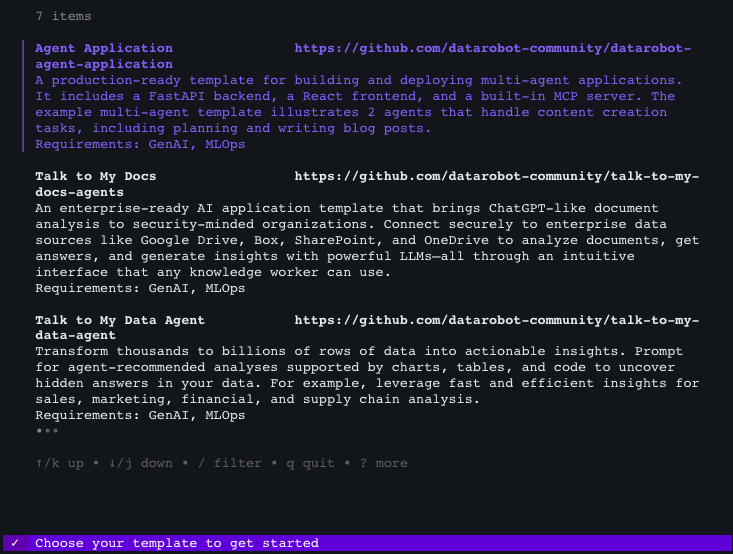 dr start対話型ウィザード(DataRobot CLIに組み込まれています)は、開発者に向けて、アプリケーションの設定を完了するまでの手順をガイドします。 dr startを実行すると、Agentic Application Starterを含むテンプレートのリストから選択できます。