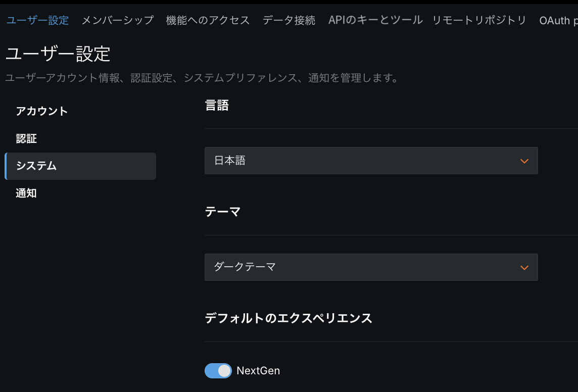 app.datarobot.comにアクセスしたときのデフォルトのランディングページが、NextGenのホームページになります。 その場合、特定のページ(たとえば、app.datarobot.com/projects/123abc/models)をリクエストすると、リクエストしたページが表示されます。 ユーザー設定 > システムを選択し、トグルを無効にすることで、NextGenの代わりにDataRobot Classicをデフォルトページにすることができます。