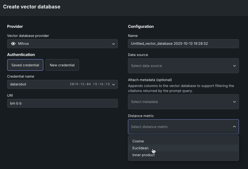 PineconeおよびElasticsearchに加えて、Milvusへの直接接続を作成し、ベクターデータベース作成の外部データソースとして使用できるようになりました。 オープンソースのベクターデータベースの代表的なプロジェクトであるMilvusは、Apache 2.0ライセンスの下で配布されています。 さらに、接続プロバイダーの距離(類似度)指標を選択できるようになりました。 これらの指標は、ベクトルがどの程度類似しているかを測定します。適切な指標を選択すると、分類およびクラスタリングタスクの効率が大幅に向上します。