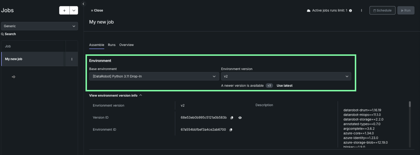 From the Assemble tab for a custom job, change the selected environment, update the environment version, or view the environment information. If a newer version of the environment is available, a notification appears, and you can click Use latest to update the custom job to use the most recent version with a successful build.