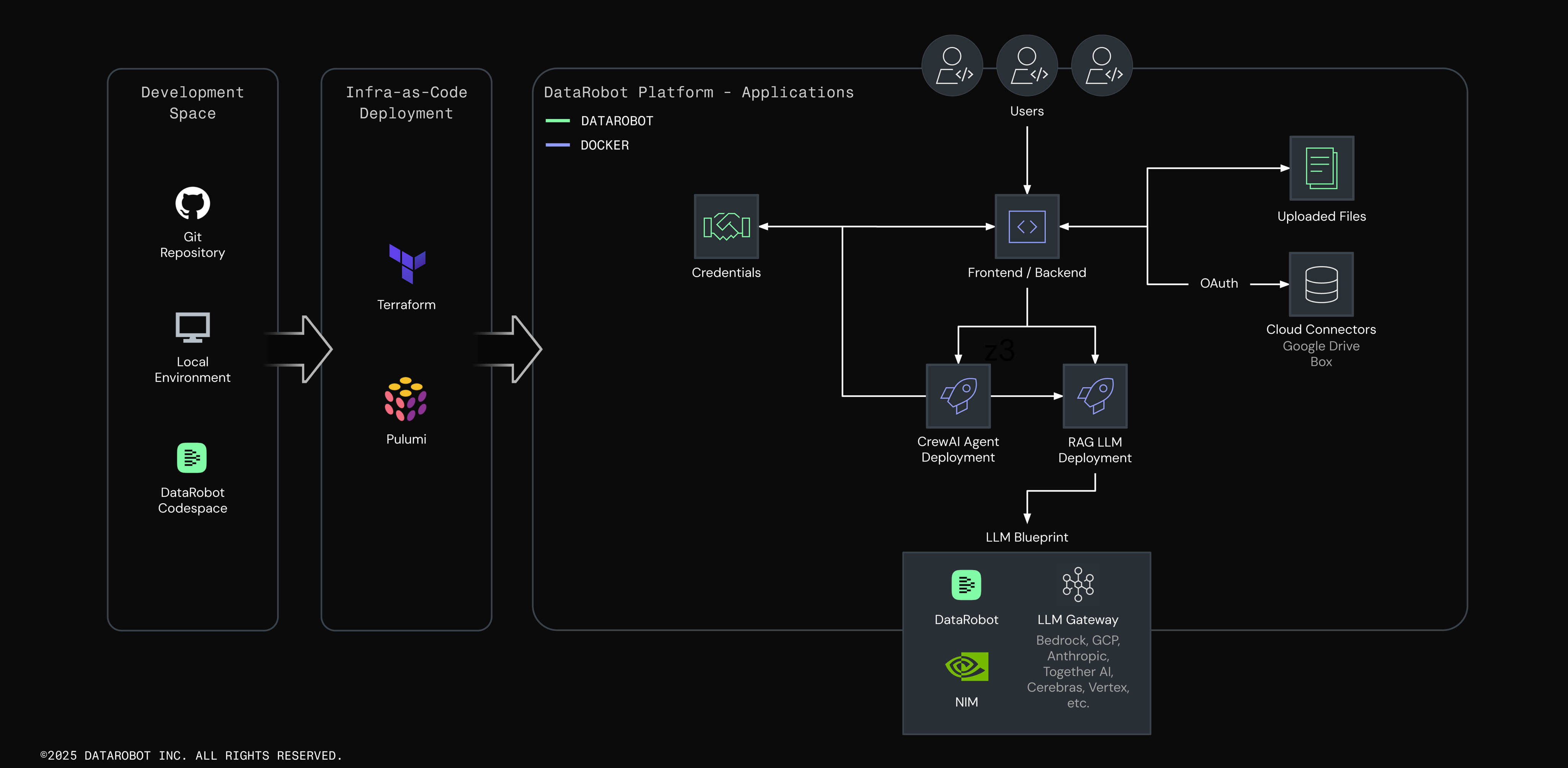 This template provides an end-to-end agentic application architecture: frontend, backend, agent runtime, and MCP server, from local development to production deployment in DataRobot, while remaining customizable for your business requirements.