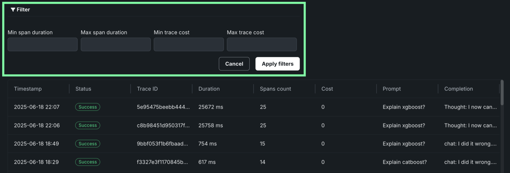 :material-filter: フィルターをクリックして、最小スパン期間、最大スパン期間、最小トレースコスト、最大トレースコストでフィルターします。 スパンフィルターの単位はナノ秒(ns)です。チャートにはスパンがミリ秒(ms)で表示されます。