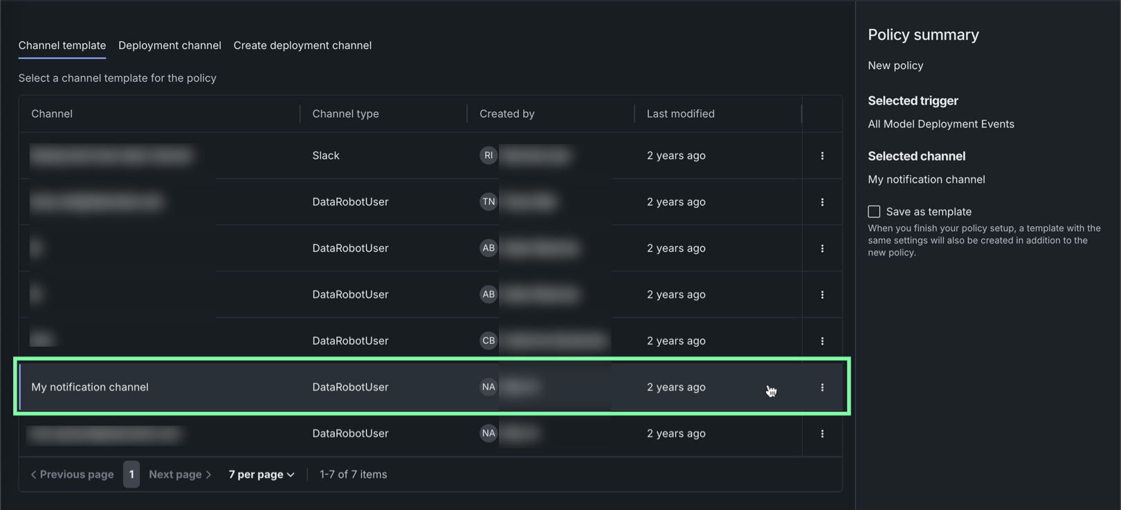 On the Select channel tab, select a Channel template or a Deployment channel associated with the specific deployment.