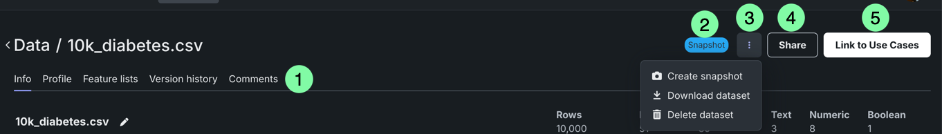 | 2 | データセットのバージョン情報 | 個々のデータセットバージョンについて、行数、その右に特徴量数、およびその他の詳細が表示されます。 |
