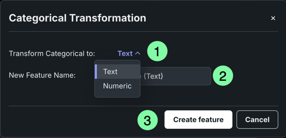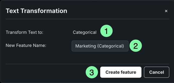 | 5 | 特徴量の変換を作成 | 特徴量の型を変更します。 |